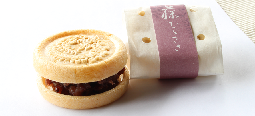 原料に近江羽二重餅を100%使用してもらい焼色はこんがりめに。オリジナルの藤の柄はここ石山寺に寄宿し「ここにしばらく藤のこぼれたるを愛す(茶丈記)」と のこした島崎藤村にちなんで。