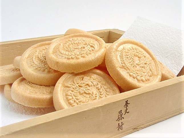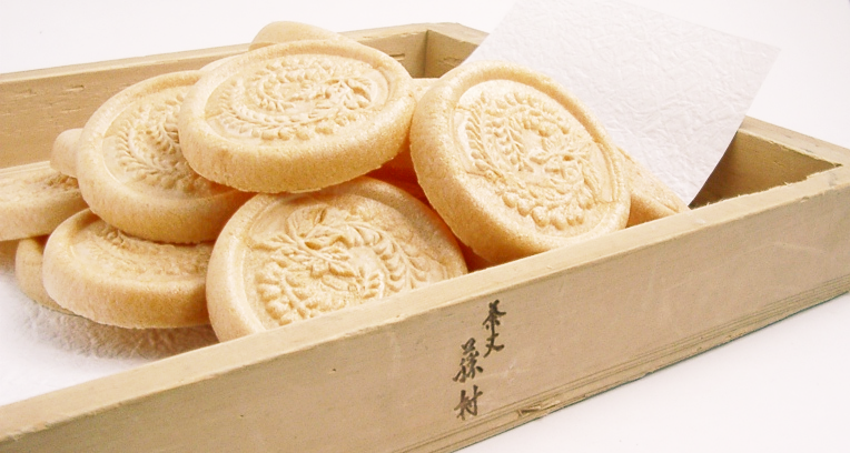 原料に近江羽二重餅を100%使用してもらい焼色はこんがりめに。オリジナルの藤の柄はここ石山寺に寄宿し「ここにしばらく藤のこぼれたるを愛す(茶丈記)」と のこした島崎藤村にちなんで。