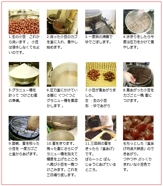 この「釜あげ丹波大納言」は、たった一粒だけでも、しっかりとした小豆の味が口中に広がります。これは、丹波大納言の奥深い味が、純粋に砂糖によって ぐっと引き出されているからなのです。