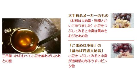 大手メーカーでは何トンという単位で小豆をたいて蜜につけるため、つけこむ蜜は何度も使って追い蜜を繰り返すのが一般的です。(蒲焼のたれのカエシと同様)そのために蜜は小豆の成分や色素が溶け出し、こんな あめ色になります。