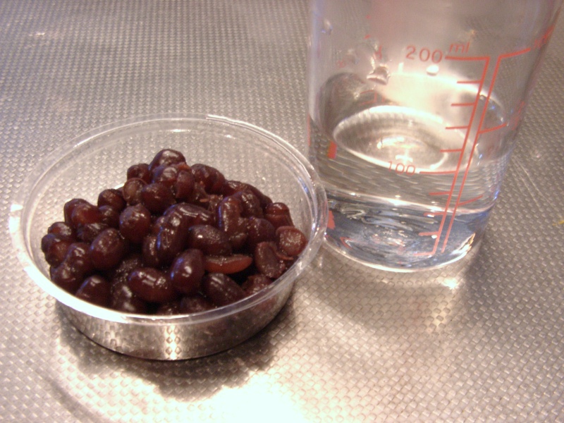 70gの釜あげ丹波大納言をコップなどにいれて トータル100~120cc の飲料水(おいしい水でつくりましょう)を最初は20ccから加えていきます。上記同様すこしずつ豆から糖分を引き出していく目的です。時間をかけてつくると皮がやぶれません。冷蔵庫で保管しながらだと痛まず安心です。出来上がりは冷たいまま「冷やしぜんざい」として、または弱火にかけて温かいおぜんざいにしてお召上がりください。