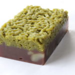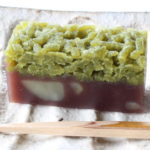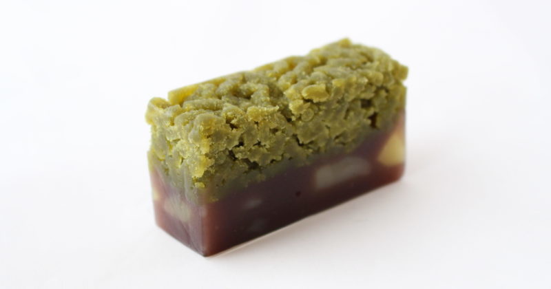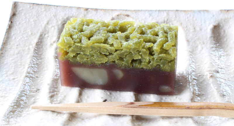 この「萌 (もえぎ)」は栗羊羹の柔らかさとのバランスを考えて抹茶村雨を もっちりさせています。