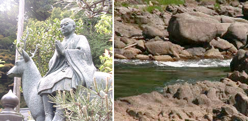 瀬田川の下流、立木観音のあたり。水かさ高く渡れずに困っていた厄年42歳の弘法大師。そこにハラリと現れた一頭の白鹿が大師を背に乗せ 急流の間を岩から岩へ跳び越え 無事に対岸へ渡したとの言い伝えから そこにかかる橋は「鹿跳橋」と呼ばれています。